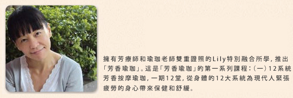 透過這系列特別設計的課程,不但能對人體12大系統有更深的認識和覺知,更能在每堂課體驗高品質的精油 ,學習將芳香按摩和瑜珈結合,帶給自己的身體更細緻而豐富的享受。